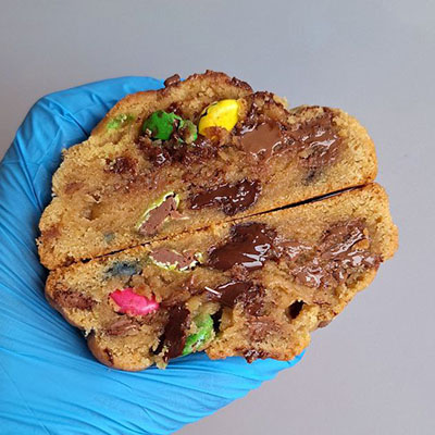 Ingredienser: mandelmjöl, ägg, socker, smör, färskost, Callebaut vit choklad (sojalecitin, helmjölkspulver), Joygelato tuggummipasta (socker, glukossirap, tuggummiarom, förtjockningsmedel (E440b), färg (E131), surhetsreglerande medel (E330), blåbärspuré, pektin, rosa, grön matfärgar (E102, E122).