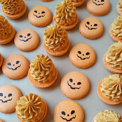 Halloween-themed spiced buttercream macarons made with pumpkin puree and warm spices (cinnamon, ginger, cloves and nutmeg). The cozy taste of autumn in one bite:)