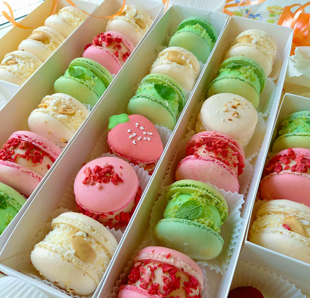 assorted strawberry-vanilla, Raffaello (coconut-almonds) and mojito (lime-mint) macarons.